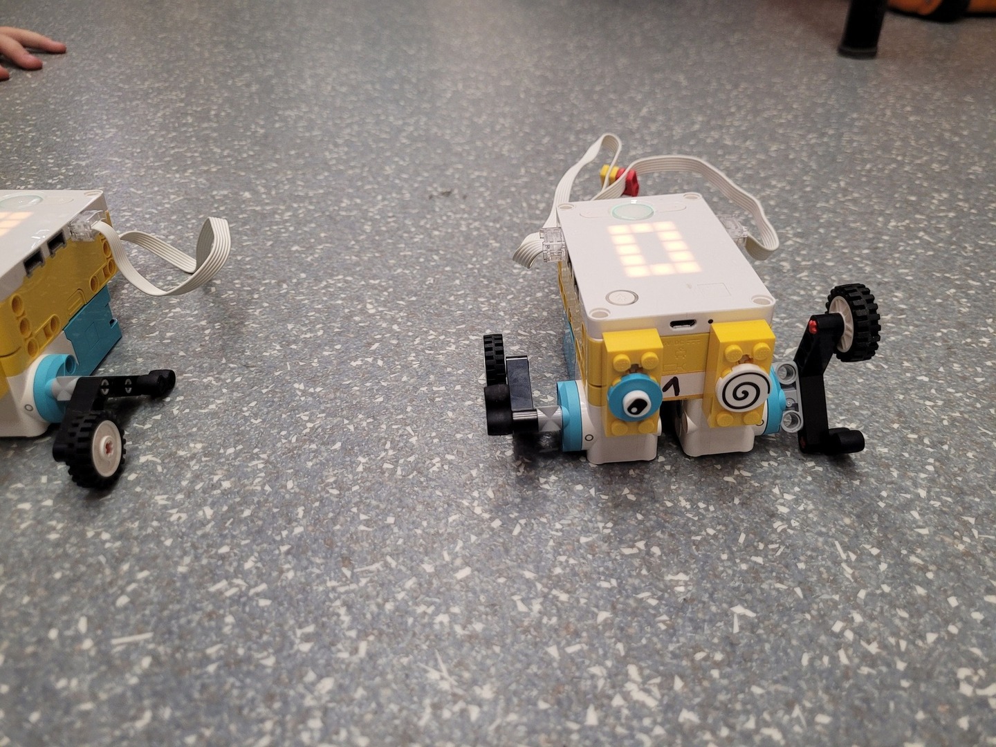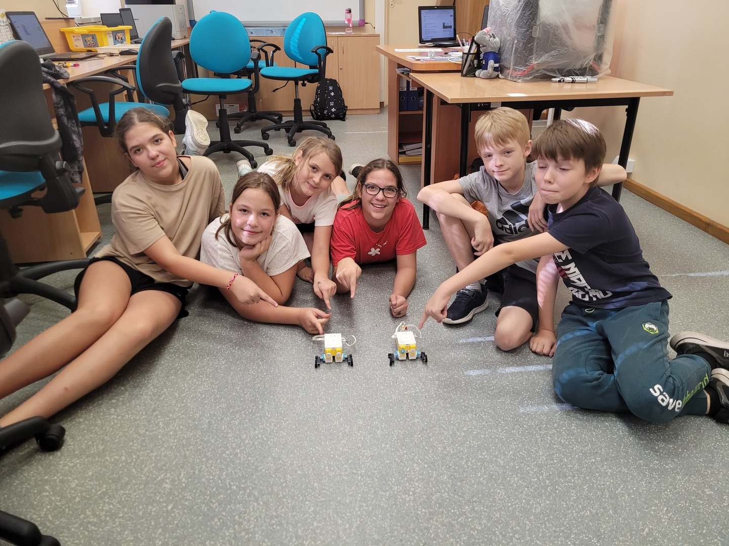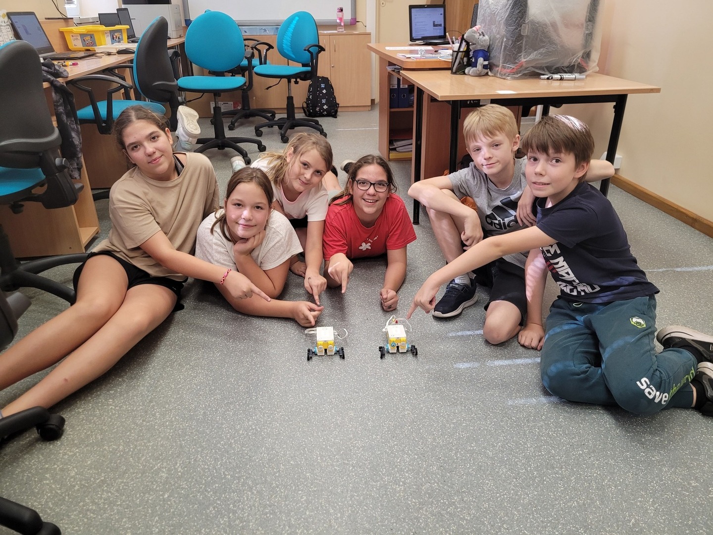 Uczniowie klasy 5 na zajęciach robotyki Lego zrobili wyścigi. Zbudowali "skoczki", które później wystartowały do rywalizacji... wyścig trudny, ale obie drużyny się nie poddawały... teraz już wiemy jak ulepszać swoje projekty.